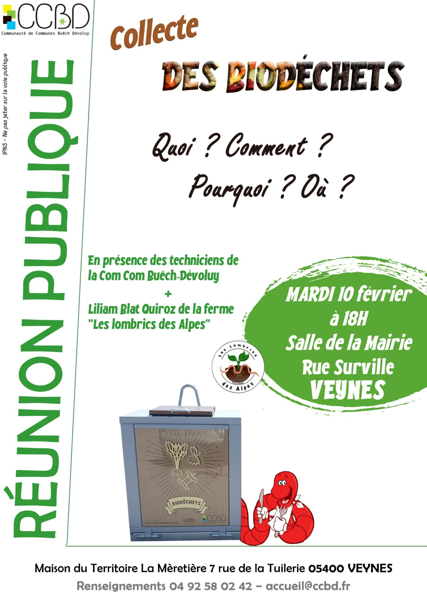 A gauche, l'annonce par la communauté de communes Buëch-Dévoluy d'une réunion sur la collecte des biodéchets incluant la question de savoir "pourquoi trier les biodéchets".